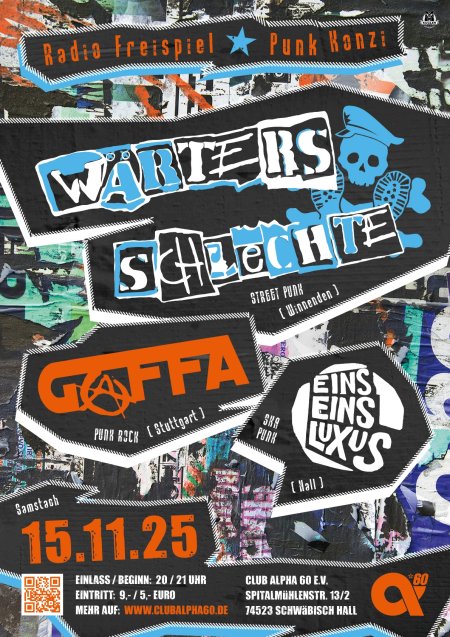 15.11.2025 Schwäbisch Hall GAFFA – Punkrock aus Stuttgart Eins.Eins.Luxus - Skapunkt aus Schwäbisch Hall Wärters schlEchte - Streetpunk Stuttgart Facebook Flyer
